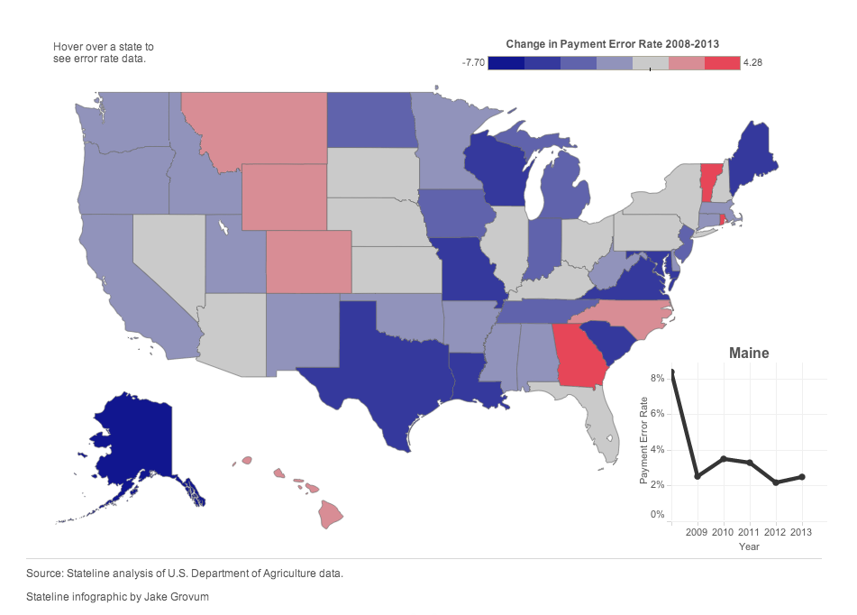 In 37 states, error rates fell between fiscal year 2008 (the recession officially began in December 2007) through fiscal year 2013, according to a Stateline analysis of U.S. Department of Agriculture data for the Supplemental Nutrition Assistance Program, commonly known as food stamps.
