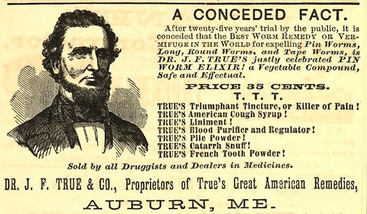 AUBURN — If you believe the advertising in the latter half of the 19th century, gulping down a bit of Dr. J.F. True’s Elixir offered the best possible treatment for everything from a headache to a lizard living in your stomach.