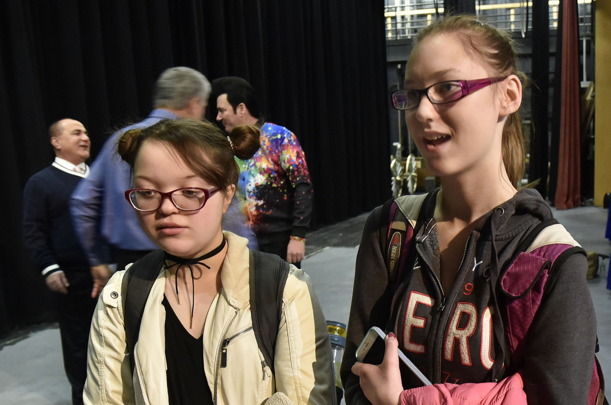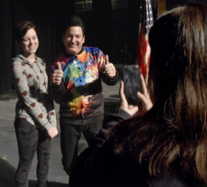 Lawrence High School student Cheyanne Arno poses for a photograph by friend Leah Gordon with motivational speaker Retro Bill after his presentation at the Williamson Center in Fairfield on Tuesday. Retro Bill performs hundreds of live shows across the country each year.