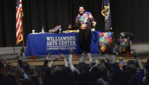On Tuesday morning at 8:30, his first show of the central Maine tour, he spoke to about 650 high schoolers at Williamson Performing Arts Center.