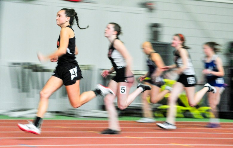 In the Class A boys, Skowhegan’s Thomas Cesak was the champion in the 55 dash in a time of 6.59 seconds. Cutter Warger’s throw of 44-04.75 earned him the shot put title, and Skowhegan’s 4×200 relay team also won the conference championship over Brunswick.