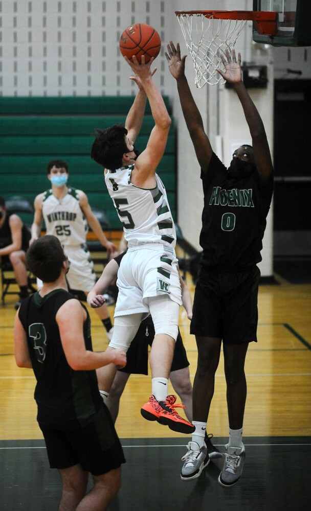 Spruce Mountain’s Bradley Shamba scored seven of his eight points in the first quarter to help the Phoenix keep within striking distance at 12-9.