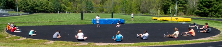 Members of the Skowhegan High School track and field team stretch before practice Thursday in Skowhegan. Michael G. Seamans/Morning Sentinel