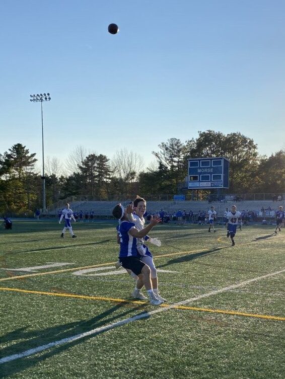 Mason Savery of Morse, left, tracks a pass before a catch over Nolan Blessington of Mt. Ararat, right, in a 7 on 7 football game last fall at McMann Field in Bath. Eli Canfield/Times Record