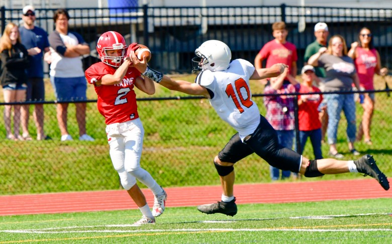 Coulombe got the call, carrying the ball left — and right into an incoming wall of River Hawks. Seemingly trapped, Coulombe cut right and found space to slip through for the touchdown with 1:39 to go.