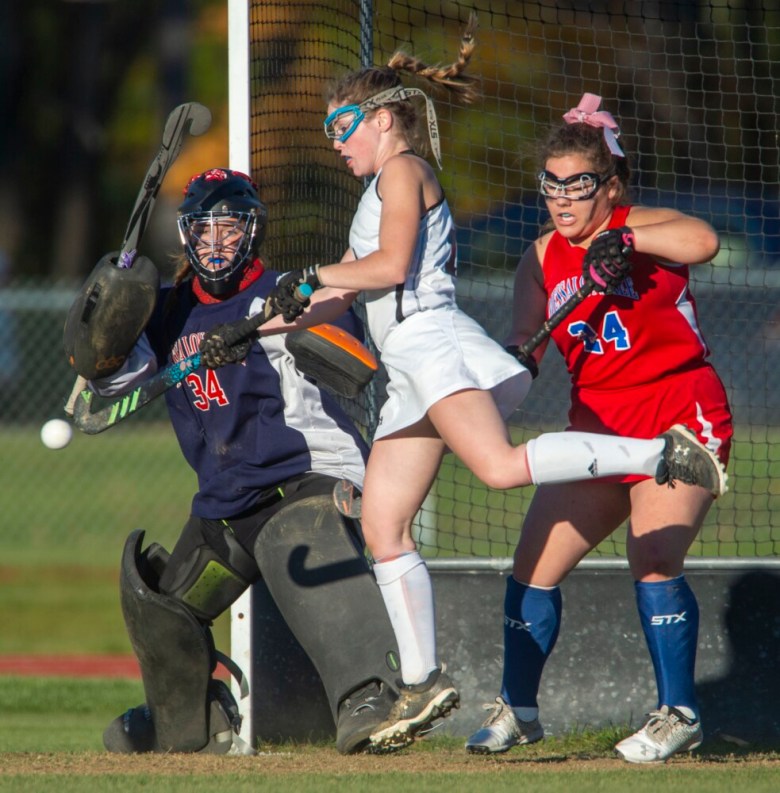 Messalonskee goalie Nealey Dillon (34) eyes the high ball as Skowhegan’s Layla Conway, center, leaps to attempt to deflect the ball into the goal in a Class A North semifinal game Friday in Skowhegan. Michael G. Seamans/Morning Sentinel
