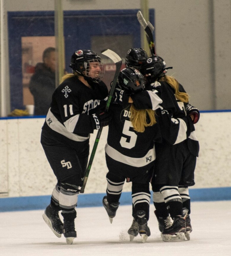 “We always preached never giving up,” St. Dom’s head coach Paul Gosselin said. “That’s the kind of team we have. We’ve had good third periods in the past. We said, ‘Look, we’re playing well, we just haven’t had some puck luck. (The Black Tigers) have a good goalie, she’s excellent. We just had to get some shots on net and one by one, it happened.”