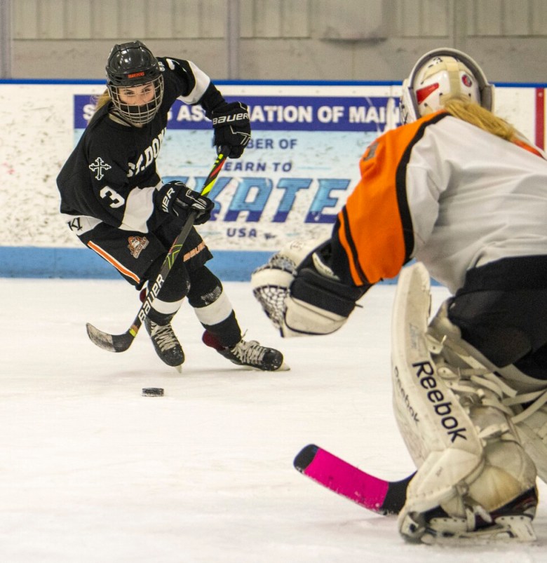 St. Dominic/Gray-NG/Winthrop/Monmouth’s West Duffy, left, scores the Saints first goal and ties the score 1-1 in the first period as Winslow/Gardiner/Brewer/Messalonskee/Lawrence/Erskine’s Jordin Williams (9) and goalie Emma Michaud look on during a Class A North girls hockey quarterfinal game Wednesday at the Camden National Bank Ice Vault in Hallowell. Joe Phelan/Kennebec Journal