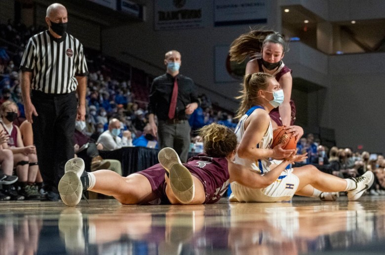 Hermon’s Megan Tracy (23) trips over Maine Central Institute’s Hannah Robinson (24) during a Class B North girls basketball quarterfinal game Friday at the Cross Insurance Center in Bangor. Michael G. Seamans/Morning Sentinel