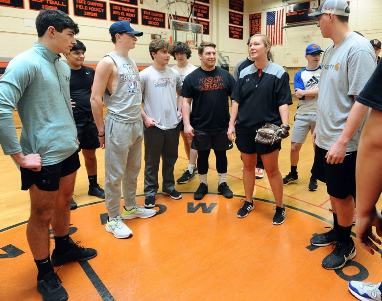 Winslow head baseball coach Beth LaFountain goes over some throwing details with Ethan Loubier, center, and other players during team practice Monday in Winslow. Rich Abrahamson/Morning Sentinel