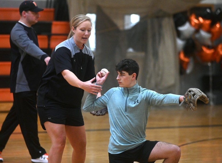 Winslow head baseball coach Beth LaFountain teaches a throwing technique during team practice Monday in Winslow. Rich Abrahamson/Morning Sentinel