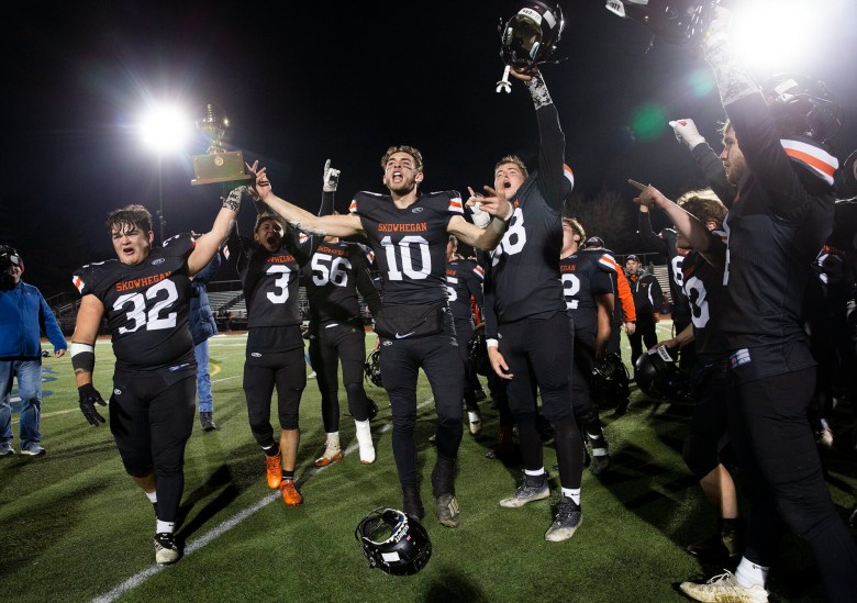 “We knew they weren’t going to give up. … We had to settle down and take it one play at a time and one stop at a time,” Skowhegan senior lineman Collin LePage said. “We just said, ‘Keep going, keep going; we’ll get it, we’ll get it.’ We got the one play we needed, and it was game over from there.”