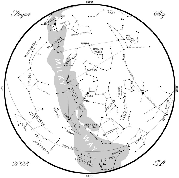 These meteors are quite fast, hitting our upper atmosphere at the edge of space about 62 miles high at 37 miles per second, which is twice as fast as the earth is always orbiting the sun. They are tiny, about the size of a grain of sand and even less dense, but the ionization energy they generate at that great speed translates into those very bright streaks of light, most of which last less than one second. All of the meteors will originate from Perseus the Hero below the circumpolar constellation of Cassiopeia the Queen, but the best place to look is about 45 degrees away from this radiant, which is in Cygnus the Swan and the rest of the summer triangle which nicely frames the summer Milky Way.