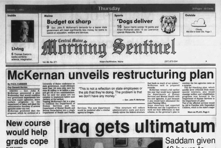 Jan. 7, 1993: Skowhegan Post Office to plans Elvis gala complete with 29 cent commemorative stamps, U.S. and its allies give Bagdad a 48 hour ultimatum, and Gov. McKernan unveils restructuring plan for agencies