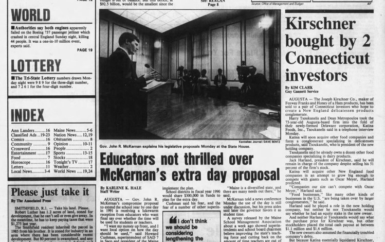 Jan. 10, 1989: Two Conn. investors hope to create delicatessen products conglomerate in central Maine, educators not thrilled with Gov. McKernan’s extra day proposal, and a man in R.I. wants you to take his land