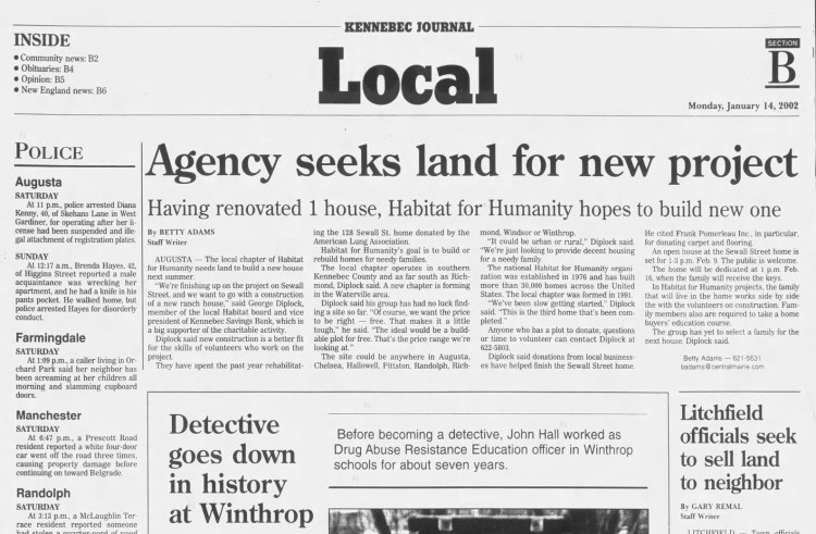 Jan. 14, 2002: Winthrop Police Department detective goes down in history, Litchfield officials seek to sell land to neighbor, and local Augusta chapter of Habitat for Humanity needs land to build a new house next summer