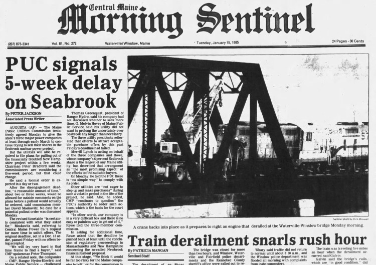 Jan. 15, 1985: Derailment of 80-car freight train on Waterville-Winslow bridge snarls traffic for miles for commuters, and PUC signs 5-week delay on Seabrook nuclear power plant