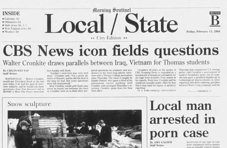 Feb. 13, 2004: Former CBS News anchor Walter Cronkite fields questions for Thomas College students in phone interview, Waterville man arrested in child porn case, and town of Wilton offered G.H. Bass building for $1.00