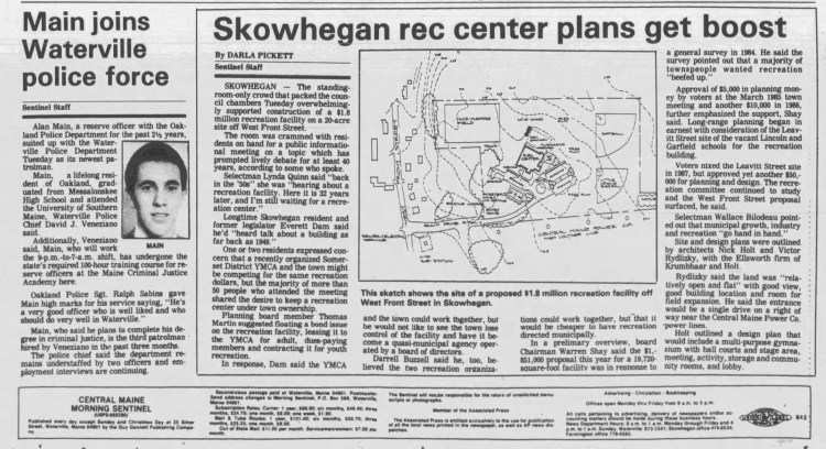 Feb. 17, 1988: Proposed $1.8 million Skowhegan rec center plans get boost, second Waterville-Winslow bridge endorsed by state, and reserve officer for Oakland Police Department joins Waterville force