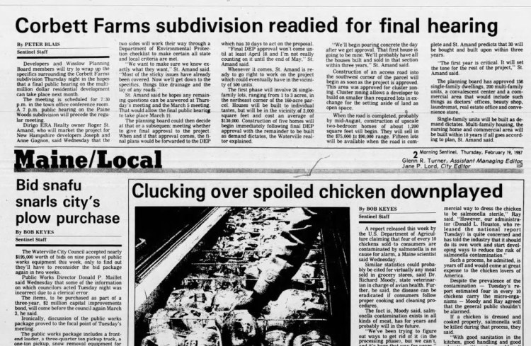 Feb. 19, 1987: USDA report that has people ‘clucking’ over spoiled chicken is no cause for alarm says Maine scientist, Corbett Farms subdivision in Winslow readied for final hearing, and Thursday nights are going to be busy nights in Fairfield twice a month