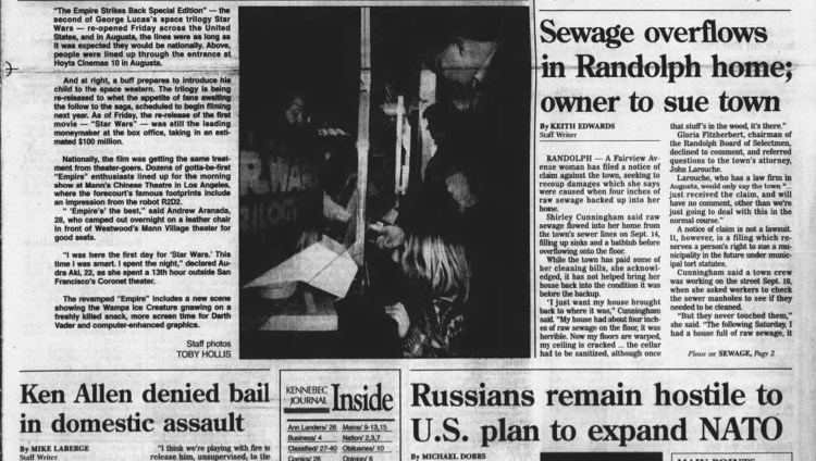 Feb. 22, 1997: Randolph homeowner to sue town after sewage overflows in her home, former Democratic aide Kenneth Allen denied bail in domestic assault incident, and the empire strikes gold in Augusta