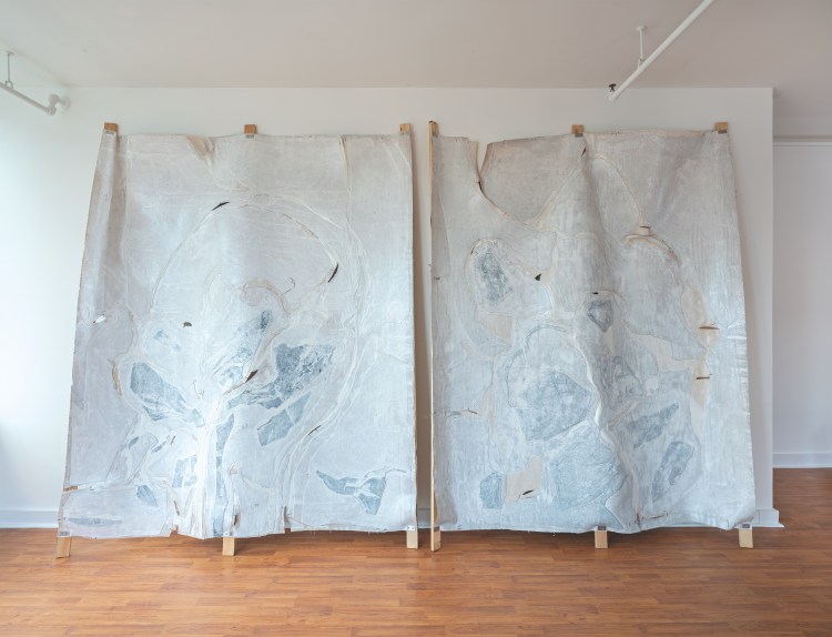 Finally, Charles stitches pieces of the canvas together, or similarly mends rips in the material. We can see the blossoms in the end result, but the work also resembles aerial topographical maps (Charles’ grandfather was a mapmaker and his father a Penobscot tribal land surveyor). This, of course, highlights the cultural clash again and the deeper implications of its “psychogeography.” Before the arrival of white people, the concept of “property” and “ownership” was unknown to Indigenous tribes. There was no need for maps and territories. But the act of stitching or mending is a way of healing what Charles calls “generational fracture.”