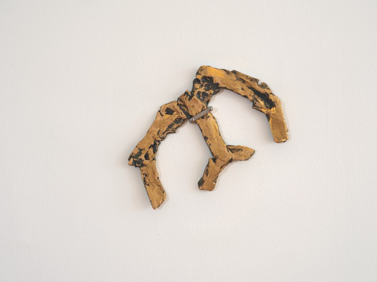 Another bird shape, “Angel,” is taken from Christian iconography. Both were initially slab-built with locally foraged clay. Charles often incorporates earth and midden from Wabanaki lands – which is to say lands colonized and stolen by European settlers. Then these figures were cast in bronze, a material and process that originated across the ocean in Mesopotamia in the 4th millennium BCE, and finally mounted with locally fabricated steel brackets (symbols of Anglo-European industrialization). Thus, these works are records of ancient peoples from which we all descend, but their specific materials and imagery represent two sides of Charles’ lineage that live within his body and personhood.