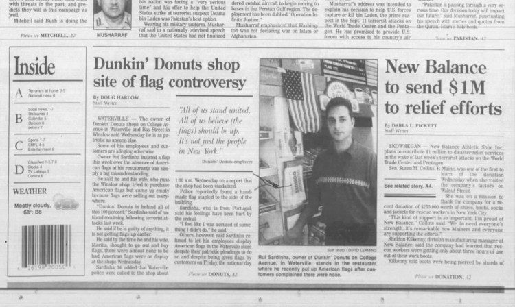 Sept. 20, 2001: A Dunkin’ Donuts eatery in Waterville is the site of flag controversy, New Balance in Skowhegan to send $1 million to support those affected by 9/11, and Sen. George Mitchell mourns those lost in 9/11 in New York City