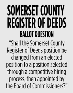 The question, which will appear on the bottom right-hand corner of the ballot that contains the five state referendum questions, reads: “Shall the Somerset Register of Deeds position be changed from an elected position to a position selected through a competitive hiring process, then appointed by the Board of Commissioners?”