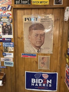 And so began a six-decade steady accretion of political ephemera: Goldwater posters, a pin saying “Kennedy, a Man for the ’60s,” an anti-Nixon “Impeach the Cox Sacker” sticker from 1973, a “Carter Mondale” poster — as his left-leaning children tacked their contributions on the walls, and up onto the ceiling.