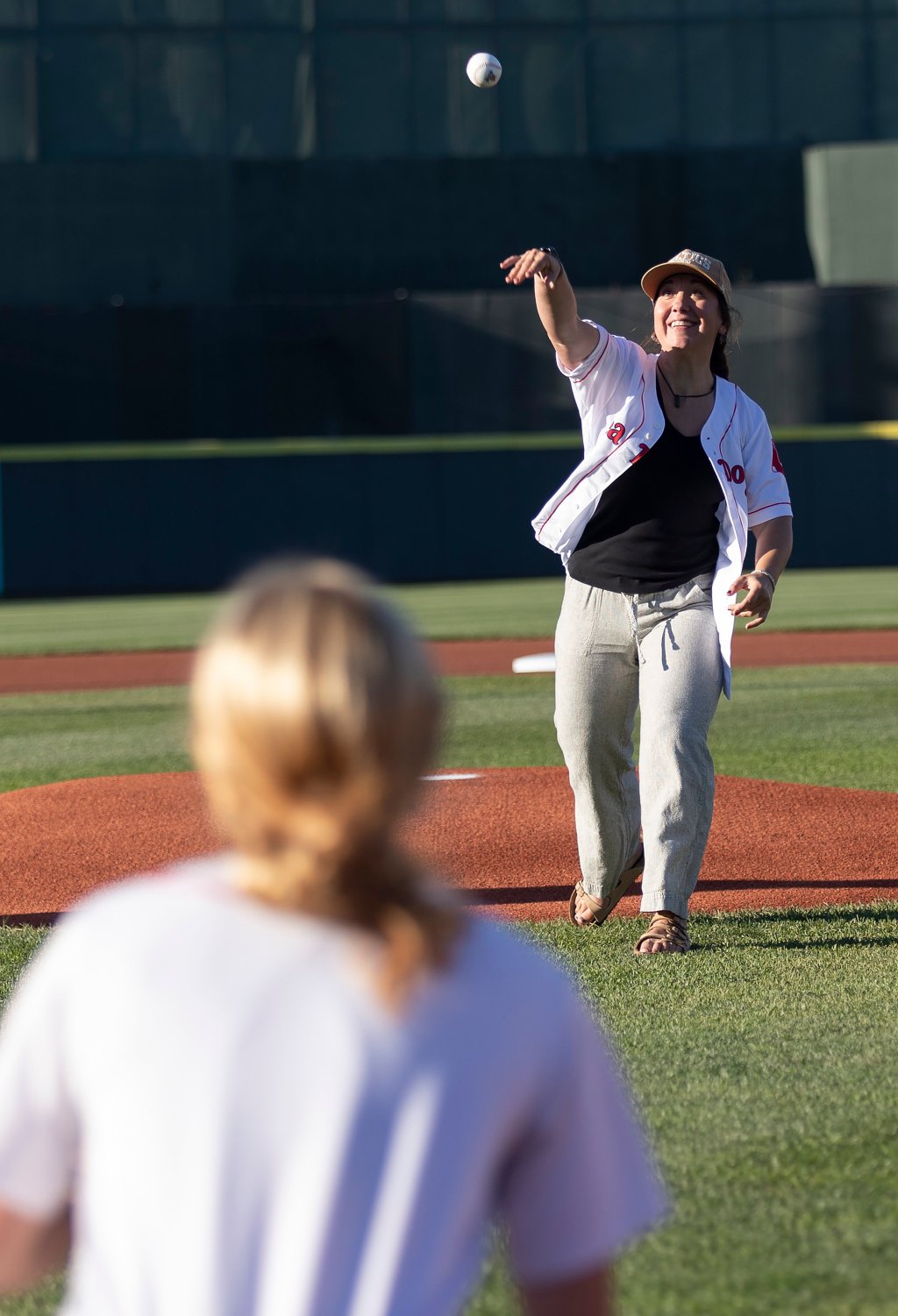 Carrie Earls, who works for the Maine Celtics and previously coached girls teams at Waynflete, throws out the first pitch to her daughter, Morgan Earls, who is a ball girl for the Portland Sea Dogs and a lacrosse player at Roger Williams University. (Derek Davis/Staff Photographer) Derek Davis/Staff Photographer