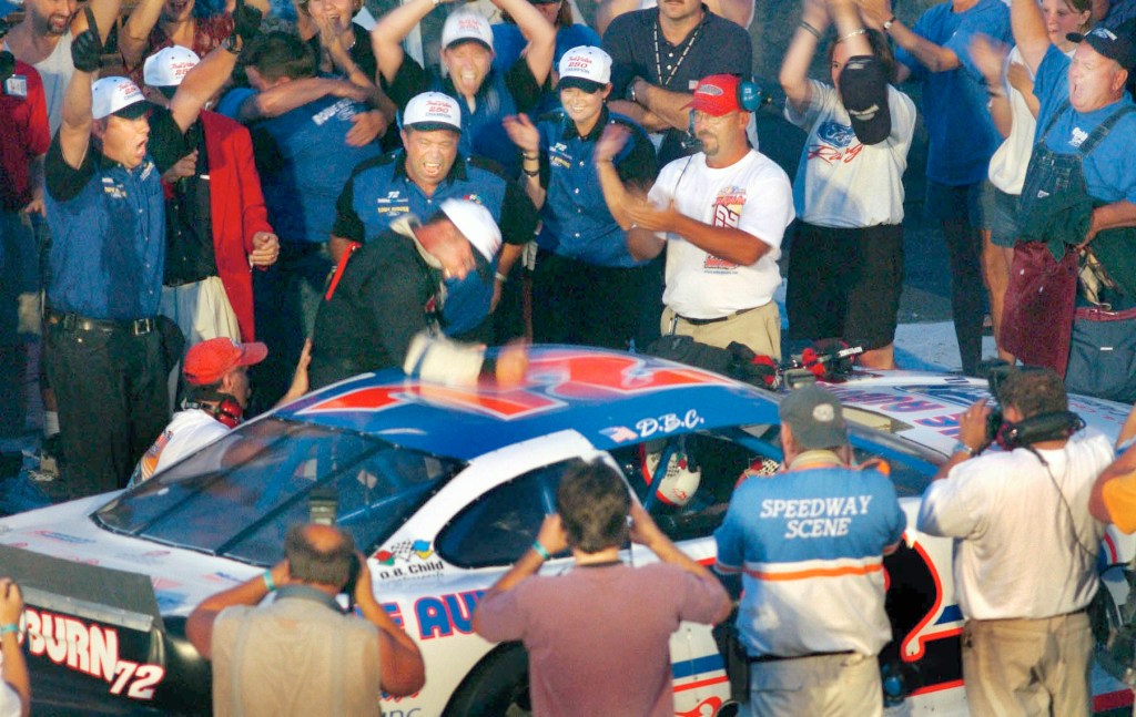 Dixfield’s Scott Robbins bangs his fist on his car to the delight of his crew after winning the Oxford 250 in 2002. Press Herald file photo