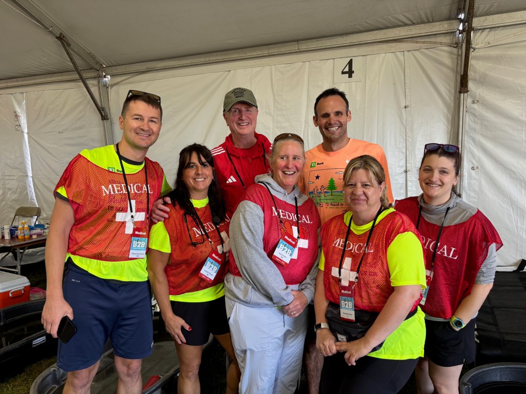 Runner Jim Gensheimer (third from right) poses with the medical team who helped him recover from heat illness at the Beach to Beacon 10K on Aug. 2. Pictured are Dr. Mikhail Romashko (from left); Jennifer Pickett, RN; Martin Kelly, PA; Dr. Amy Parker; Gensheimer; Elizabeth Scott, NP; and Michaella Vecchiarelli, RN. (Patty Wight/Maine Public)