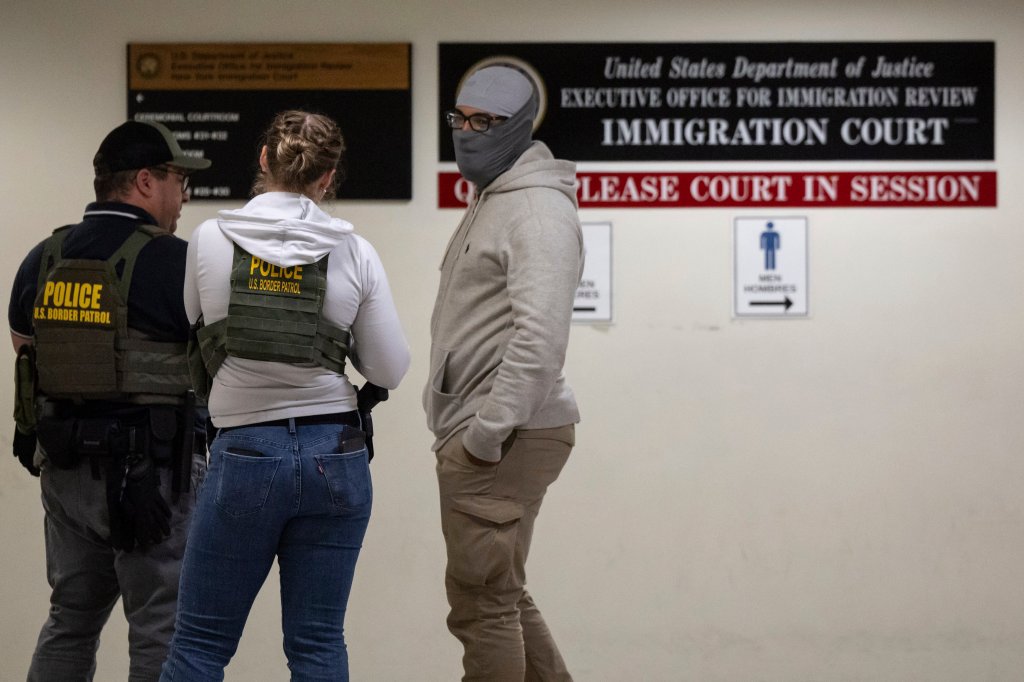 Border Patrol agents wait outside an immigration courtroom in June at the Jacob K. Javits Federal Building in New York. (Yuki Iwamura/Associated Press)