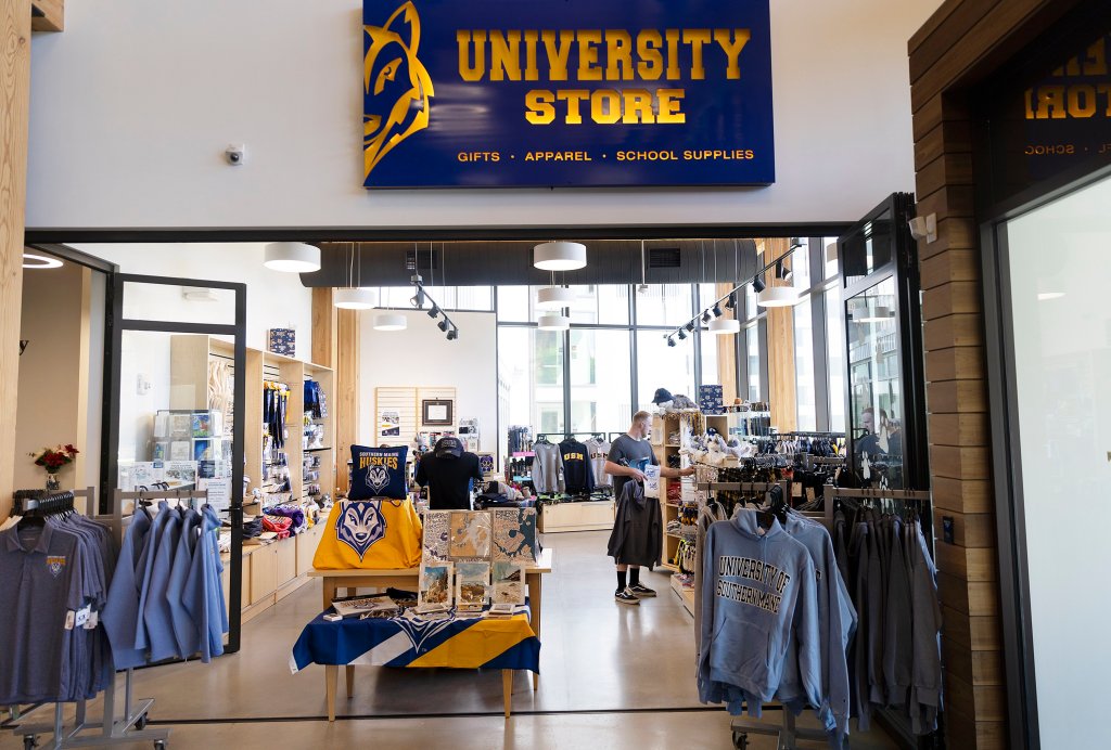Tim Shannon of Philadelphia shops in the University Store at the University of Southern Maine’s McGoldrick Center in Portland on Thursday. Shannon, who said that he took some years off following the pandemic, decided to go back to school, where he is studying environmental science. (Derek Davis/Staff Photographer)