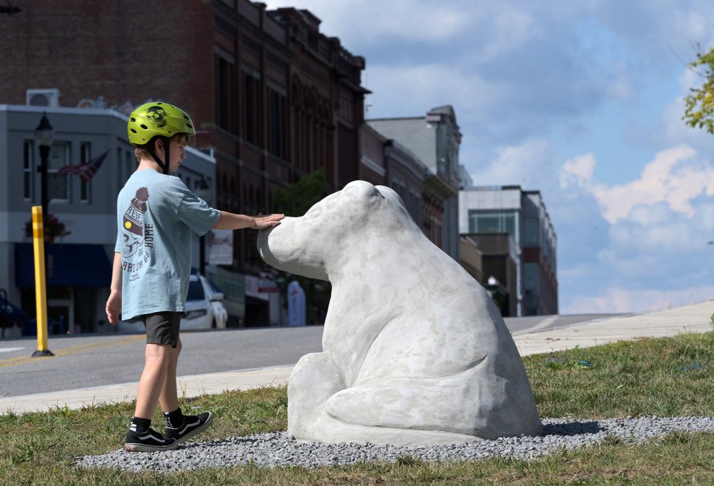 Jameson Pooler, 8, of Waterville, touches a sculpture Wednesday at Levine’s Park in Waterville. Wild Maybes, a set of sculptures by artist Chris Miller, are installed at the park in preparation for downtown Waterville’s First Friday celebration. Main Street from Temple to Spring streets will be closed for a block party to celebrate arts and business downtown. (Rich Abrahamson/Staff Photographer)