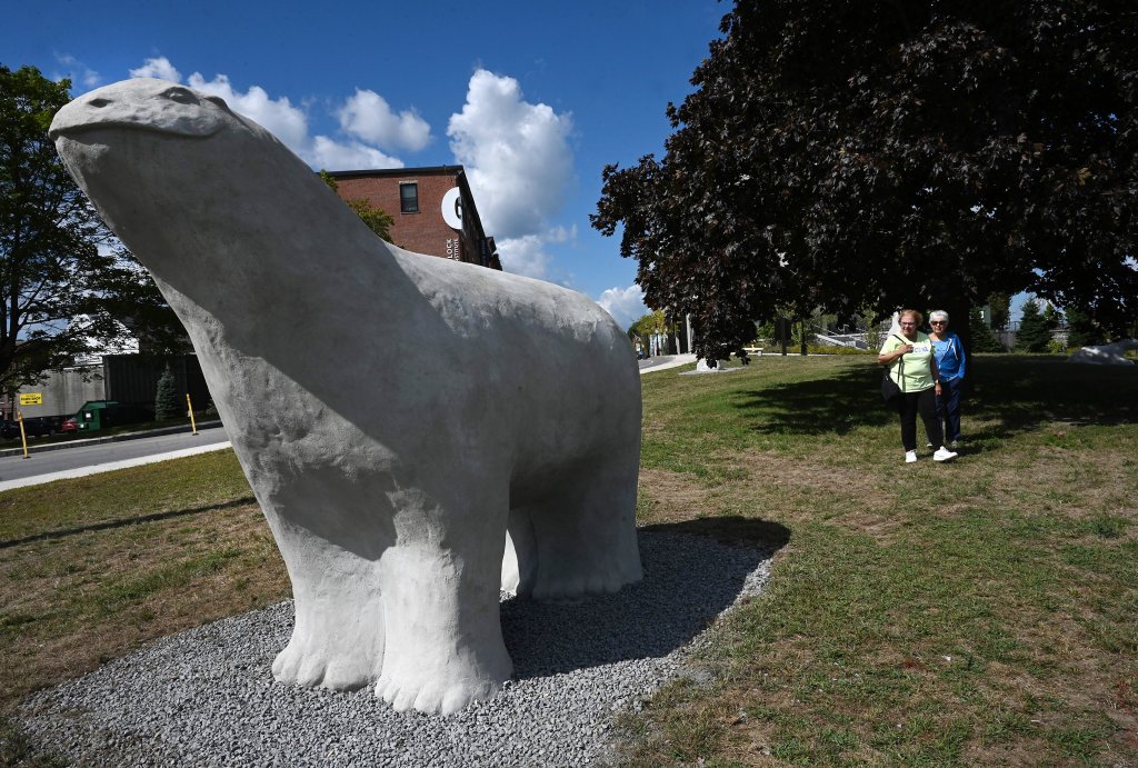 The largest sculpture is about about 8 feet tall and weights 7,000 pounds, the second-largest about 5,000 pounds, and the two smaller ones, 1,700 to 2,500 pounds. Miller said he created them in the yard of his South Portland studio. They were trucked to Waterville and moved by crane onto heavy bases.