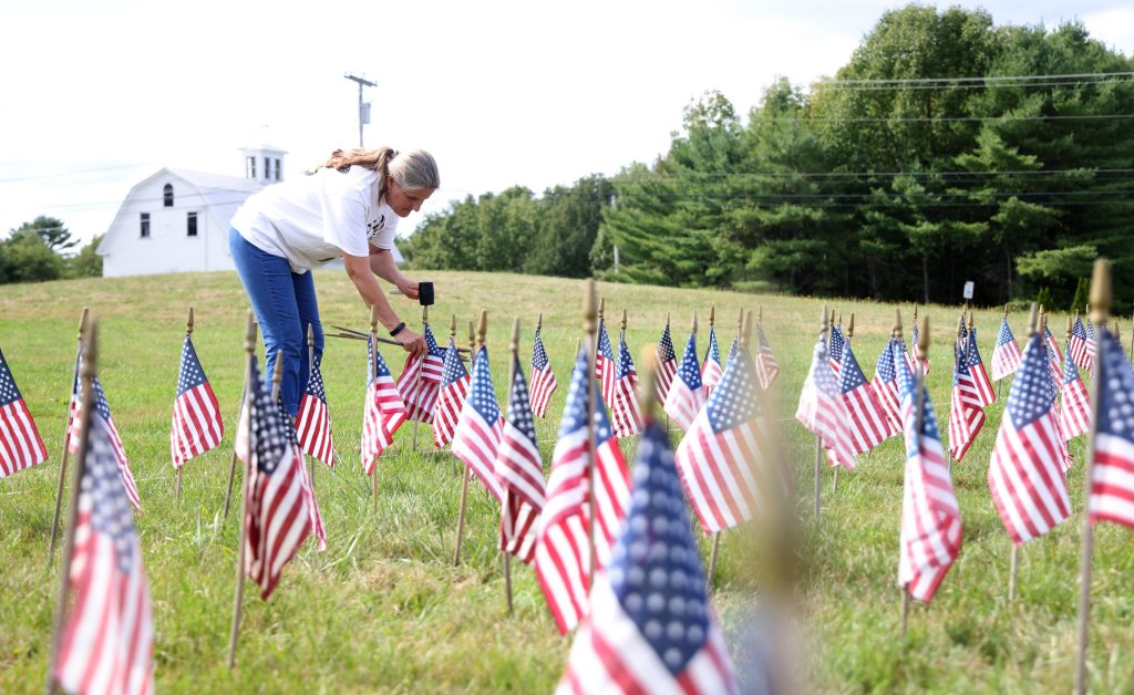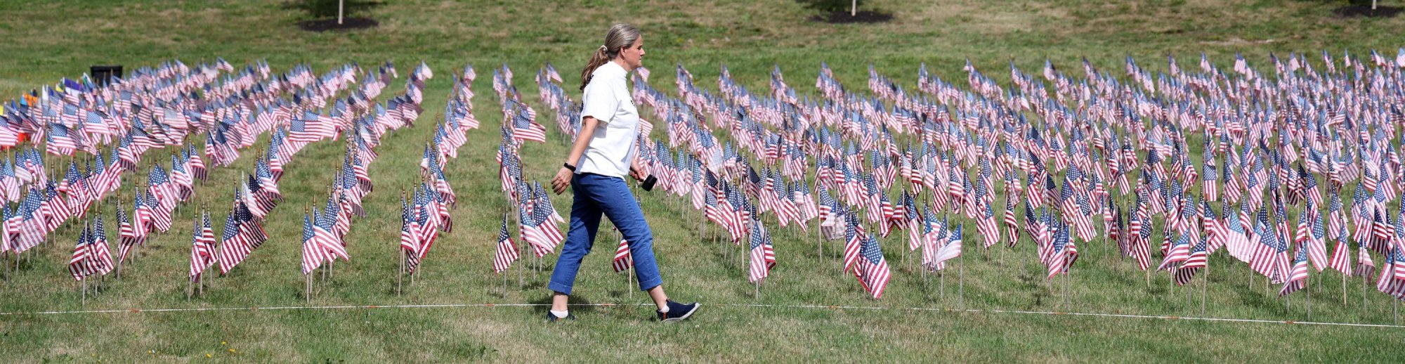 Mary Pono walks by the 9/11 flag memorial outside of Skowhegan Area High School on Sept. 8. Each year, Margaret Chase Smith School students set up the memorial in front of their school, but with construction still taking place there, the memorial was added at the high school this year. (Anna Chadwick/Staff Photographer)