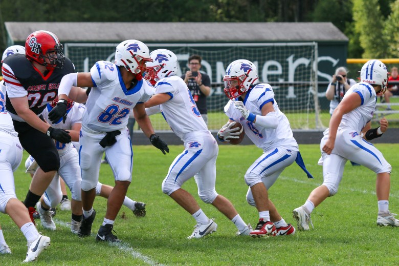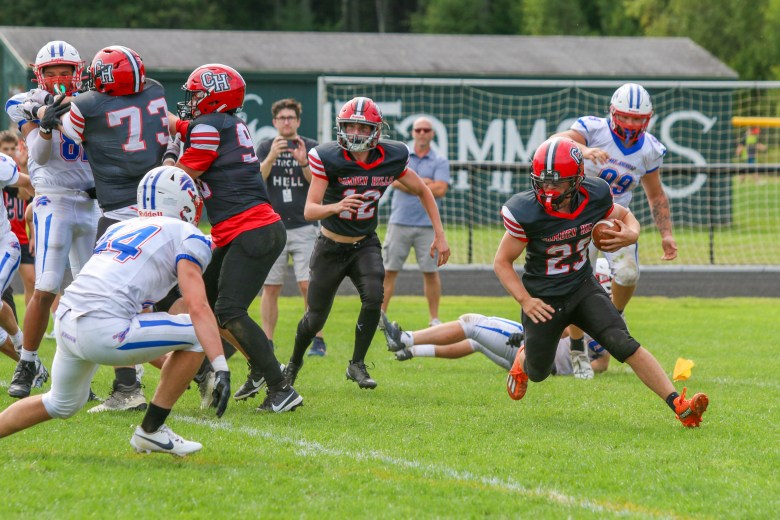 Camden Hills (2-0) unsuccessfully tried an onside kick and gave Mt. Ararat (1-1) a short field. Four different Eagles took turns carrying the ball before junior running back Joshua Merriman (22 carries, 117 yards, two TDs) capped the 10-play drive with a 3-yard run.