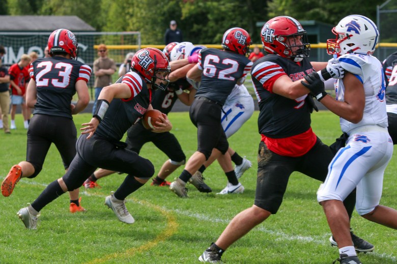Camden Hills quarterback Hollis Schwalm (6 of 14, 98 yards, TD; six rushes, 59 yards, TD) and Beveridge started to establish a connection on the opening drive of the third quarter, but it wasn’t until the next drive when they began rolling.