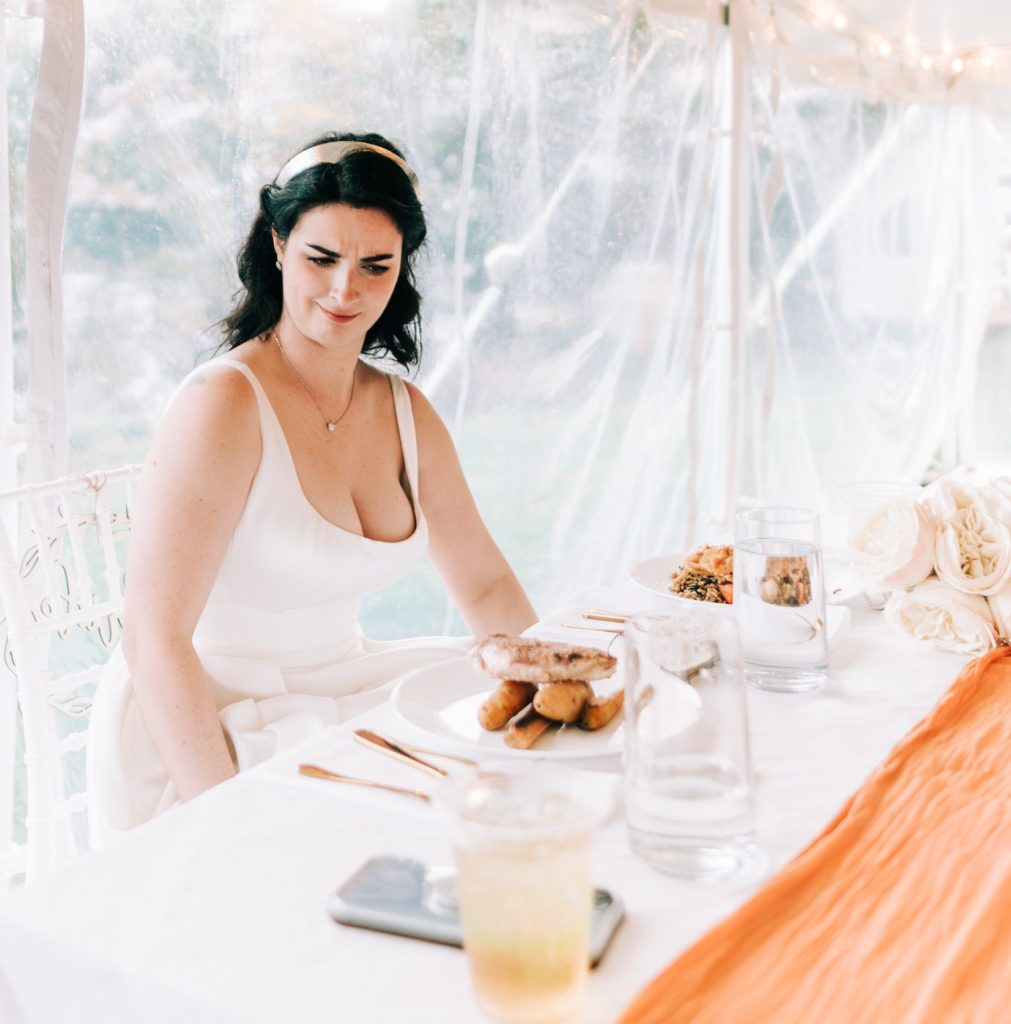 The wedding was contracted for 140 guests, but ended up being around 100. “By the time I got to the cocktail hour, I was already horrified. There’s actually a professional photo of me receiving my dinner on my wedding day and grimacing.”