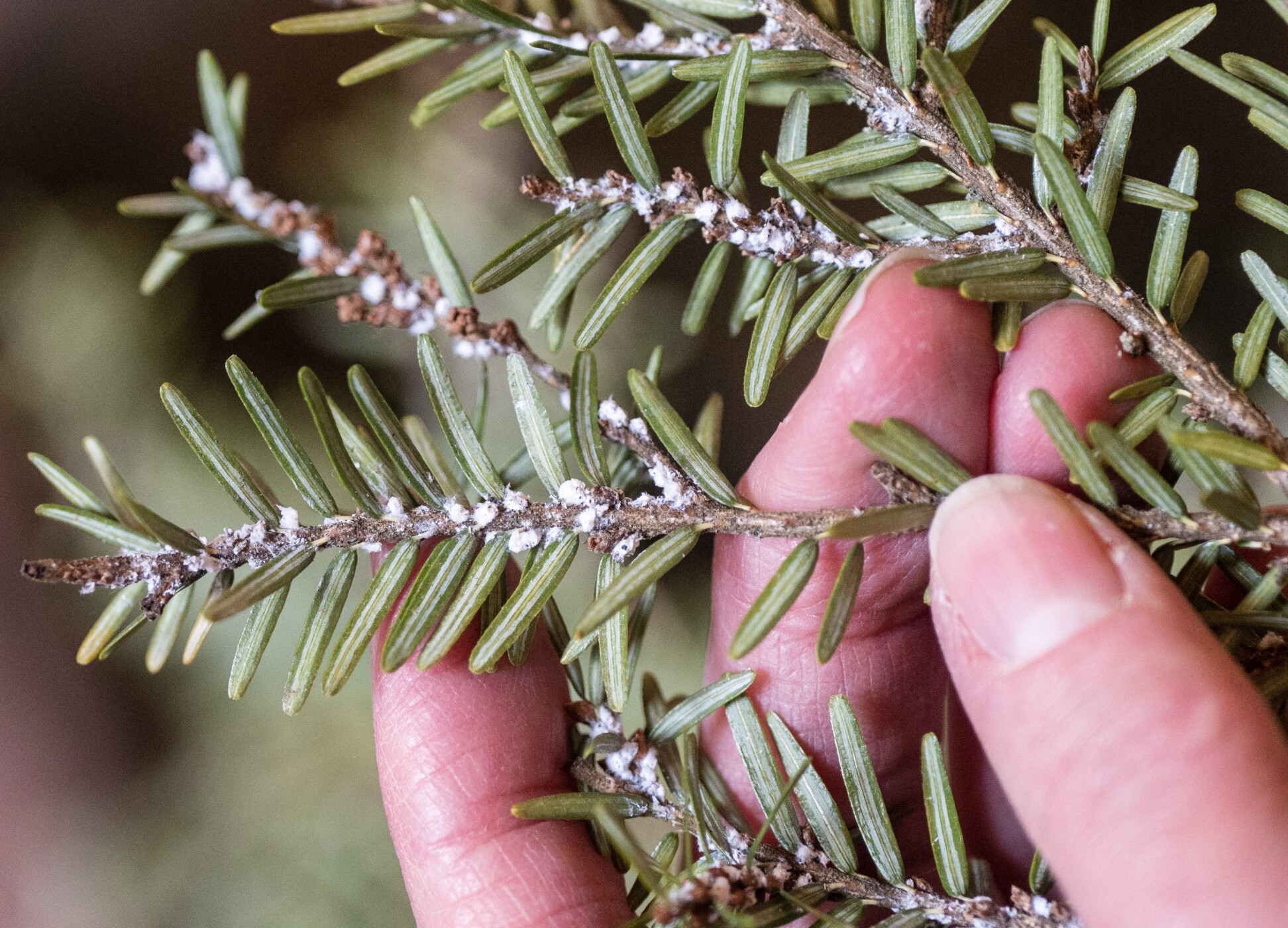 In forested areas, hemlock woolly adelgids spread through infested twigs and canopy material, making the movement of top branches and chips high risk. Balsam woolly adelgids feed in the upper canopy, can cause long-term tree deaths and reduce seed stock for future restoration.
