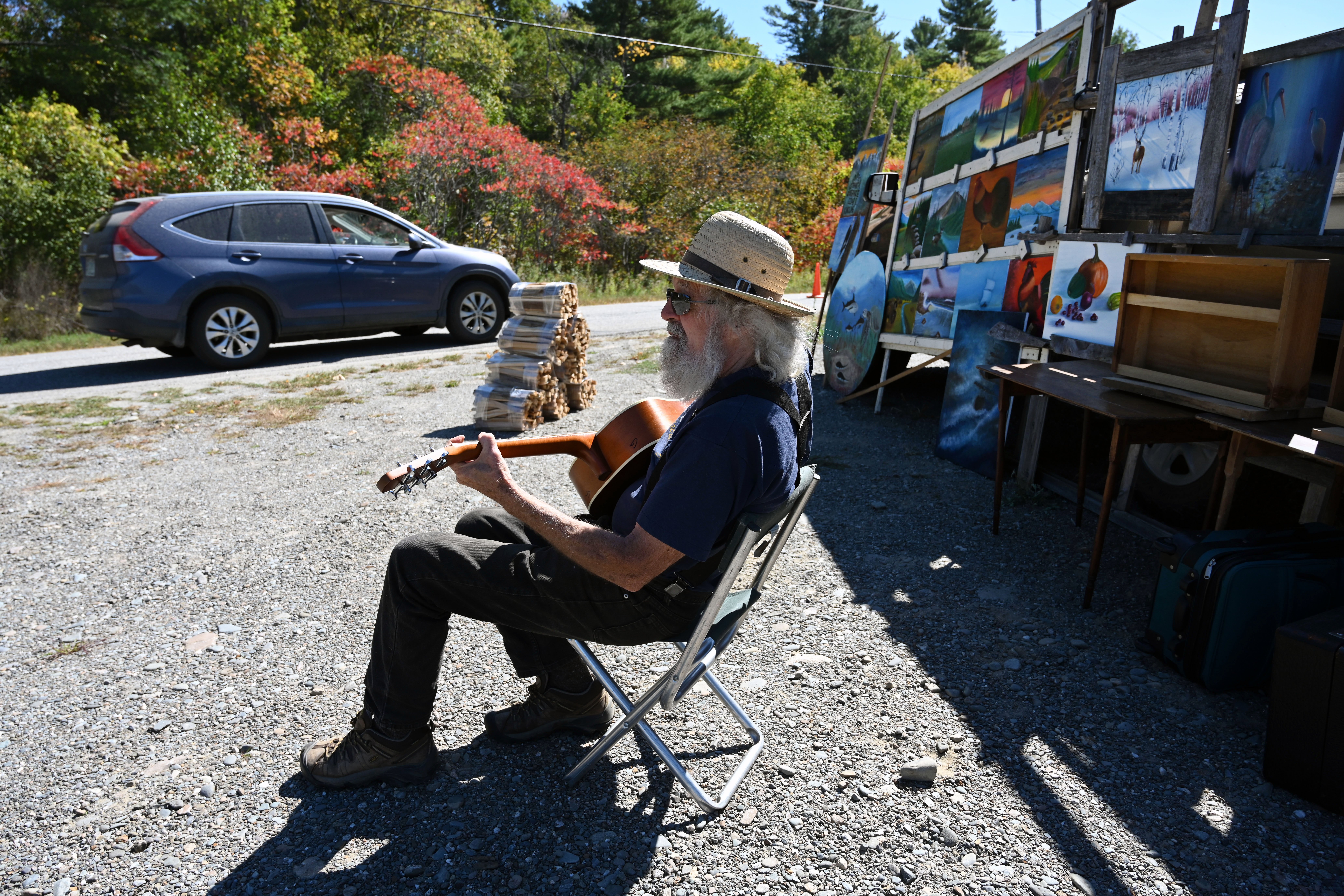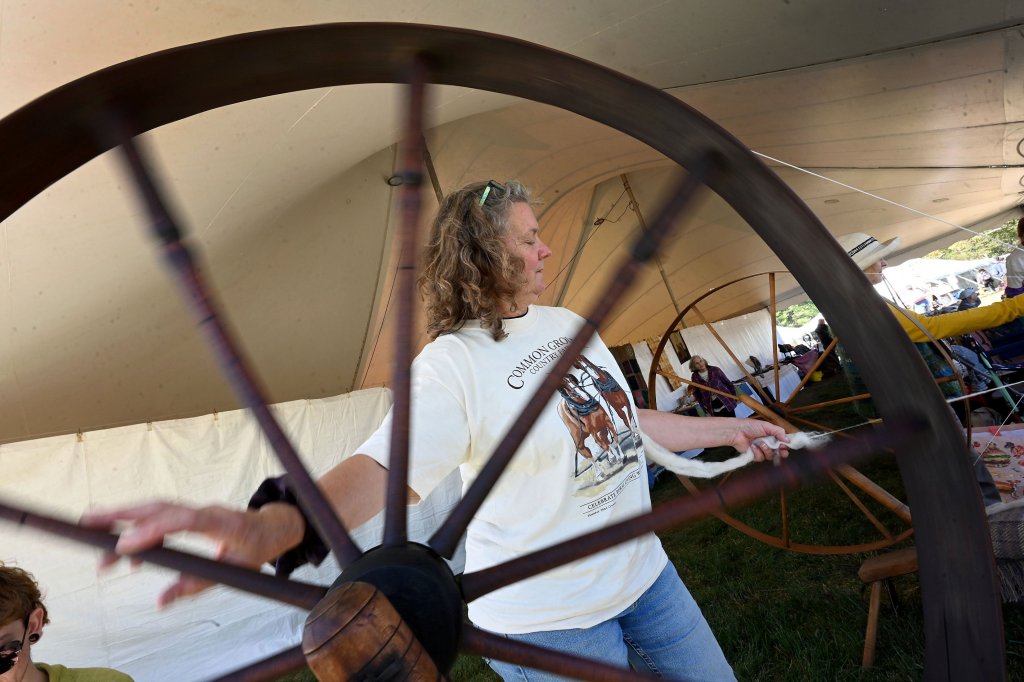 Susan of the East turns her great wheel, walking wheel while spinning sheep wool into fine yarn Friday during a demonstration at the Maine Organic Farmers and Gardeners Association Common Ground Country Fair in Unity. The spinning wheel was made in about 1800 in the Mid Atlantic. (Rich Abrahamson/Staff Photographer)Mark Kerns, 71, of Thorndike plays guitar and sells his oil paintings and Maine organic kindling Friday near the entry to Maine Organic Farmers and Gardeners Association Common Ground Country Fair in Unity. Kerns played “Freight Train,” “Jesus Love Me” and other songs. The fair runs through Sunday. (Rich Abrahamson/Staff Photographer)
