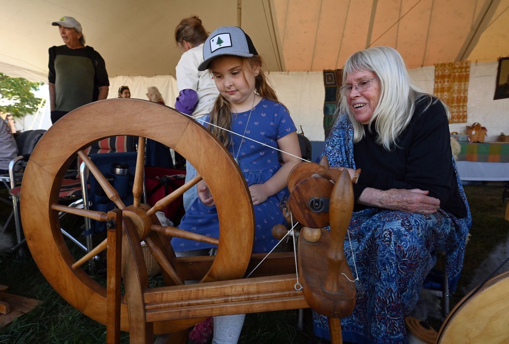 Gail Grandgent of Little Cranberry Island shows Cora Veilleux, 7, of New Portland, how a spinning wheel is used to make yarn from sheep wool during a demonstration Friday at the Organic Farmers and Gardeners Association Common Ground Country Fair in Unity. About 20 spinning wheels were used during the demonstration by the Wednesday Spinners group. (Rich Abrahamson/Staff Photographer)