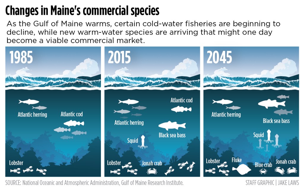 Climate change helped turn Maine into the lobster capital of the U.S. when the waters in southern New England became too warm for the species’ preferred thermal range of 50 to 64 degrees.