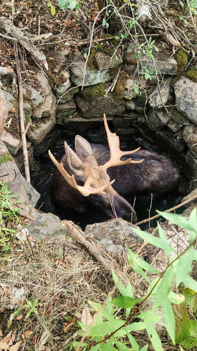 “You’re looking down and can just see its body and head as it’s moving around inside the well,” Dunham said of his first glimpse of the moose. “It could pick its head up and see out, but it couldn’t get its legs in place to find purchase to get out.”