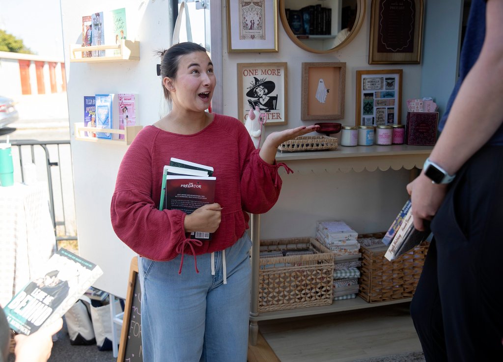 At 10 a.m. sharp, a Sabrina Carpenter song started playing inside the trailer from a speaker hidden behind a canister of bookmarks. Displayed on the same side table were book-themed candles, a red coupe glass filled with Kindle charms and a basket of stickers. Fake leaves and pumpkins lined the tops of the bookshelves along the walls.