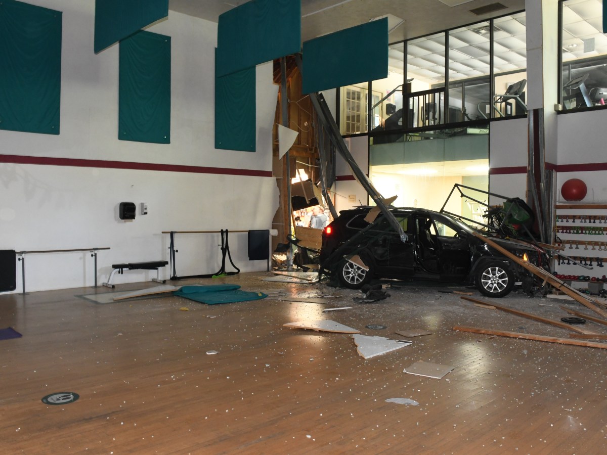 Police reported only minor injuries after a Jeep Cherokee crashed through an exterior wall and drove about 200 feet through an open racket center.
