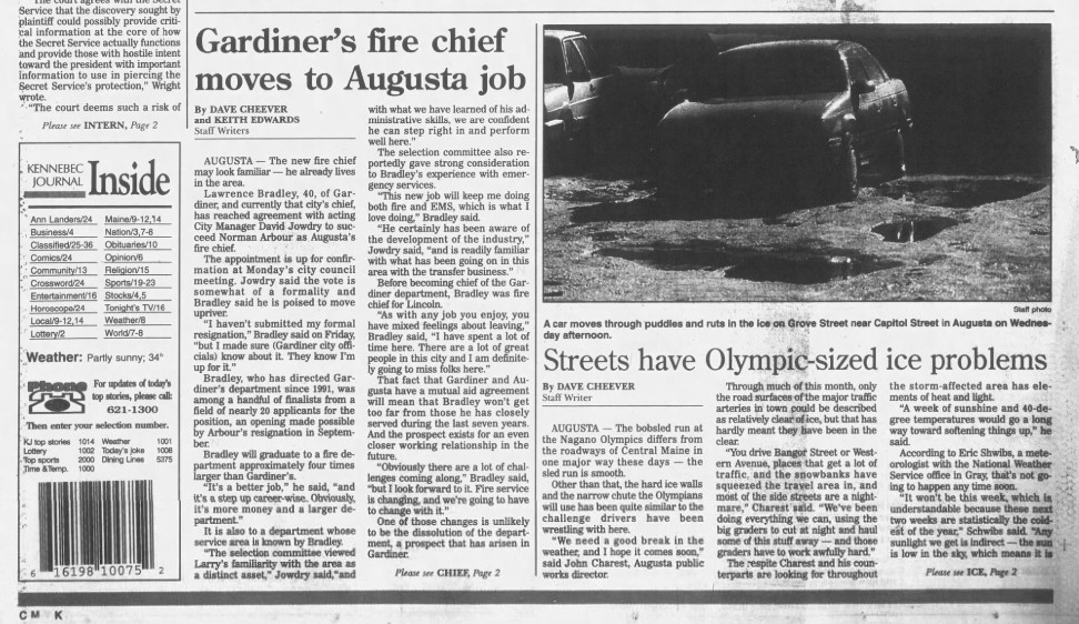 Jan. 31, 1998: Gardiner fire chief moves to be fire chief in Augusta, democrats unveil plan to spend surplus, and Augusta-area streets have a ‘olympic-sized’ problem