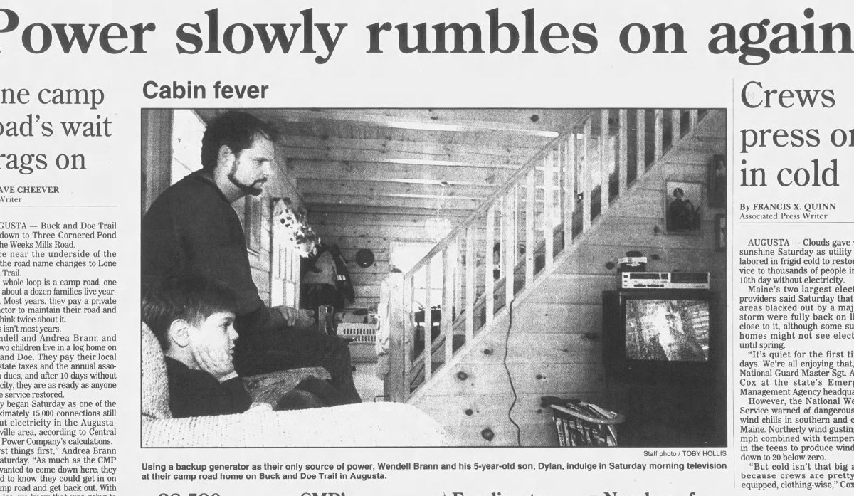 Jan. 18, 1998: Susan Collins goes 5 days without power at her Bangor home after historic ice storm. Also, this Augusta homeowner is going on day 10 without power.